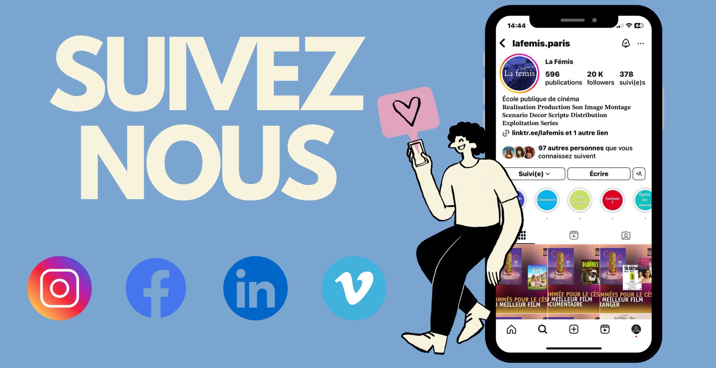 Retrouvez la Fémis sur les Réseaux Sociaux ! Ne manquez rien de la vie de l’école et de ses actualités ! Suivez La Fémis sur les réseaux sociaux pour tout savoir sur nos projets, événements et les diplômés de demain.
