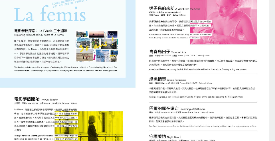 Accueil | L’École | Actualités | Actualités de ces derniers mois | 2017 Juillet 2017 CARTE BLANCHE FÉMIS AU TIIF - TAIPEÏ Le Festival international du film de Taipeï (TIFF) à Taïwan (du 29 juin au 15 juillet 2017) accorde 3 programmes Carte Blanche à l’école. « Le Concours » de Claire Simon sera également programmé en ouverture de cette Carte Blanche et le 1er long métrage de Léa Mysius « Ava » sera présenté en (…)